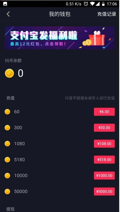 3、进入钱包后我们首页就是目前你已经有的抖币,这里是0,点击下面的充值选项,根据充值金额的不同选择相应的按钮
