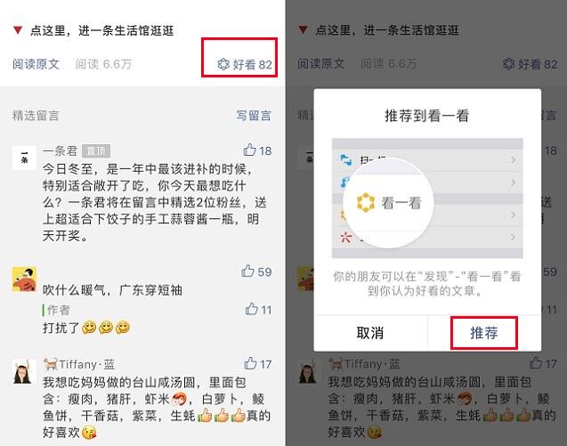 2、在微信7.0.0版本中,订阅号文章底部原来的“点赞”会变成“好看”按钮,点击之后会弹出是否“推荐”选项,点击“推荐”即可将这篇订阅号文章推送到你的“好看”朋友圈。