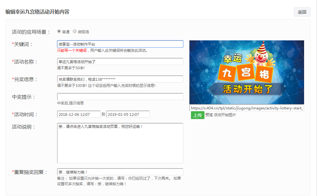 2.开始填写活动信息,因为我们是做微信公众号抽奖小程序所以活动应用场景要选择普通、填写一个关键词,当粉丝输入此关键词将会触发此活动;编辑活动名称、活动兑奖信息、中奖提示、活动时间和活动说明,还可以替换背景图、继续编辑活动结束内容等