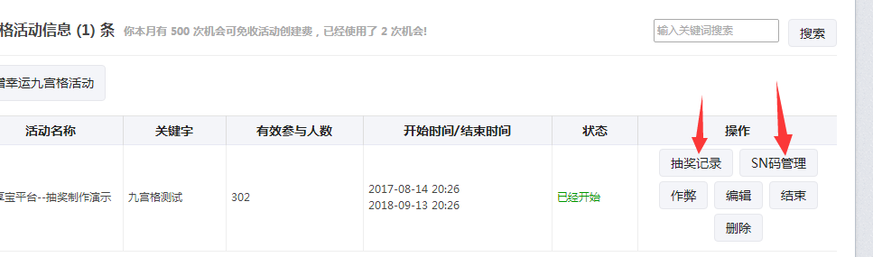 最后关于微信抽奖小程序活动的数据查看,在制作抽奖活动页面,点抽奖记录或者SN码管理,可以查看所有参与活动的用户信息记录。