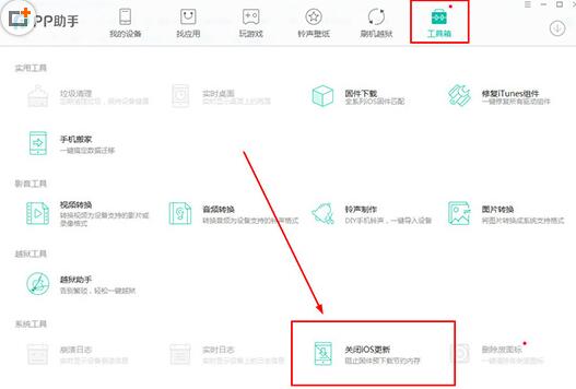 2、在上方一排的栏目中选择并点击“工具箱”选项,在系统工具那一栏中可以看到今天的主角,也就是“关闭iOS更新”功能选项,开启iOS更新关闭此功能之后,将可以帮助用户减少因为每次系统预更新固件所带来的内存不够的情况,相信很多经常玩手机游戏的用户肯定知道,最讨厌的事情就是在玩游戏的途中弹出系统更新的提示,非常影响游戏过程中的正常操作,但是只需要使用PP助手中此功能,就能够摆脱这些烦恼,如下图所示: