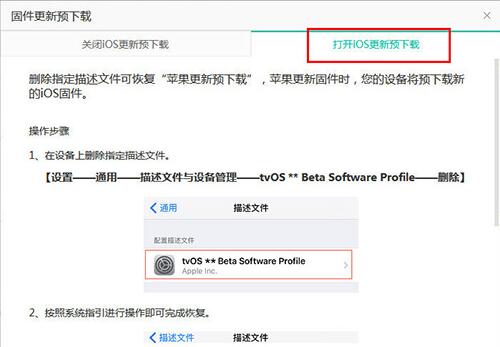 5、如果想重新开始iOS更新的预下载,只需要在第三步的界面中点击打开iOS更新预下载的选项,内有详细的步骤,如下图所示: