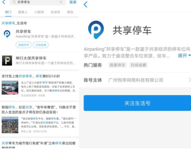 打开手机支付宝,进入首页,搜索【共享停车】,点击进入,关注生活号,