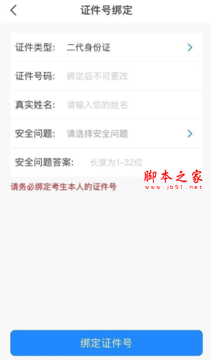 3、证件类型可以选择二代身份证、港澳台身份证、护照等类型(大陆学生只能通过二代身份证进行绑定或注册),填写真实姓名,选择安全问题(安全问题可以用来密码找回)。手机号注册用户可跳过步骤4“身份证号注册”。