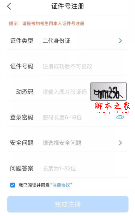 4、在手机号注册界面选择下方的【用证件号注册】按钮注册,注册时证件类型可以选择二代身份证、港澳台身份证、护照等类型(大陆学生只能通过二代身份证进行绑定或注册),输入密码及手机号,选择安全问题(安全问题可以用来密码找回);