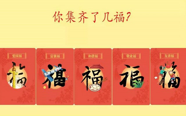 今年的支付宝集五福瓜分红包活动与去年差不多,依然可以通过扫一扫或AR扫描“福”字来进行集五福,如果不出意外的话,五福应该依然是敬业福、富强福、和谐福、爱国福、友善福。