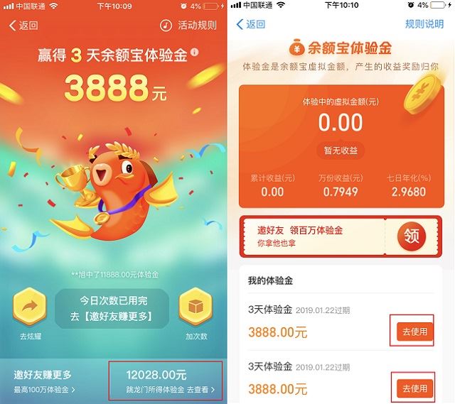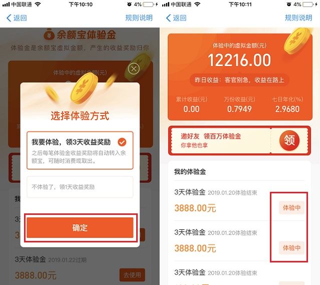 以目前余额宝收益2.968%为例,一万块钱体验金,一天利息差不多0.79元,如果是10万的话,利息是7.9元,最高100万的是则为79元/天,体验期限为3天,相当于最高可赚超过220元。当然,很少用户可以领取到100万体验金,一般几万的比较多,比如5万体验金,一天差不多4元左右,3天能薅羊毛12元左右,虽然不多,但有总比没有强吧。