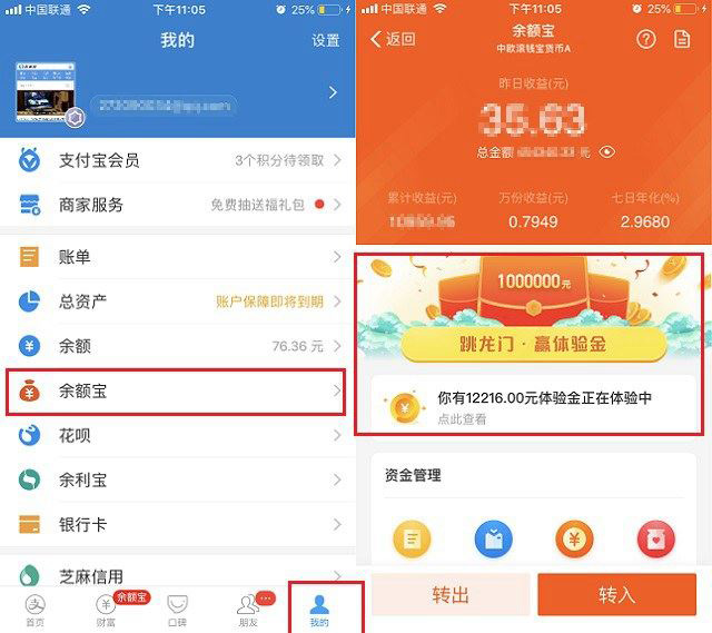 3、当跳完6次之后,当天就不能再完游戏领体验金了,右下方可以看到您跳龙门累计获得的“体验金总额”,这是点击进入去使用即可。需要注意的是,获得余额宝体验金之后,需要去使用才会产生收益,如下图所示。