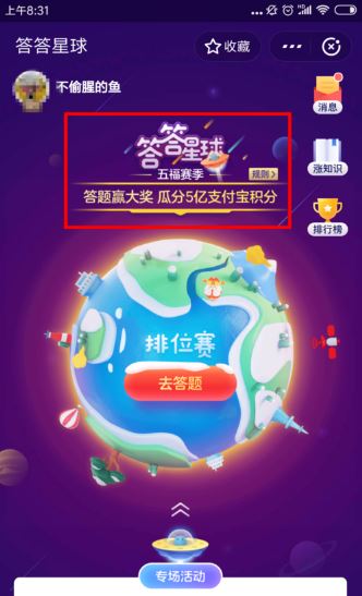 查看了第二赛季的成绩后,就可以在【答答星球】的主页中,找到关于五福的一些活动规则,我们点击查看一下。