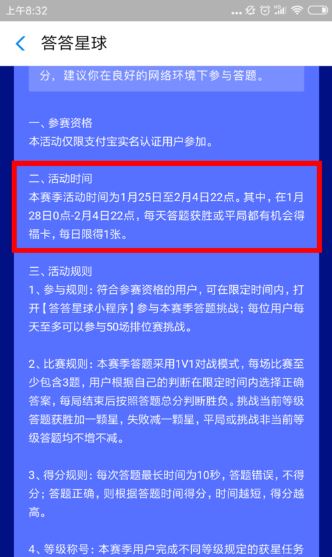 从规则中我们可以看到,答答星球获得福卡的活动在1月28日到2月4日之间才会开启,在活动期间,每日答题获胜或者平局都有机会获得福卡,但是每日限得1张。