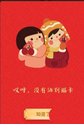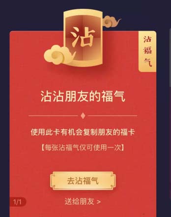1、今天大家扫福的时候,有的人突然多了一个沾福卡,说的是可以得到好友的福气,首先,我们要知道如何使用沾福卡。