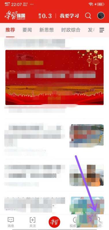 将学习强国app打开,在首页点击下面的“我的”选项,下图演示。