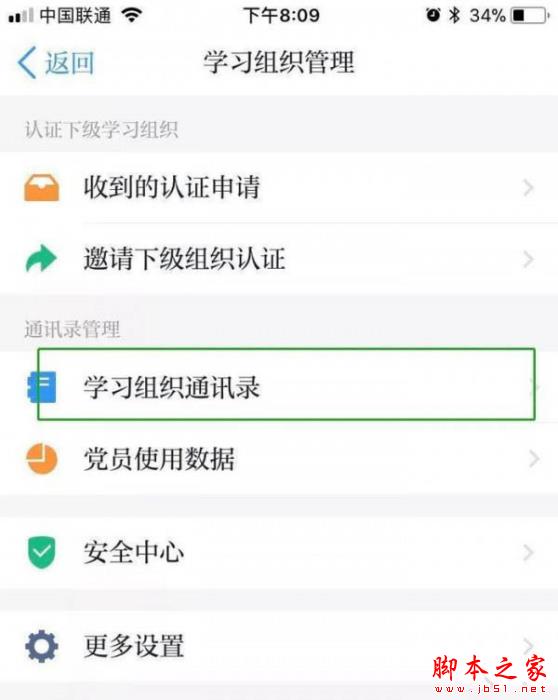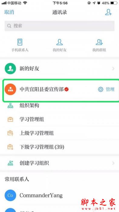 进入“消息”页面→“通讯录”→点击某学习管理组右侧的“管理”