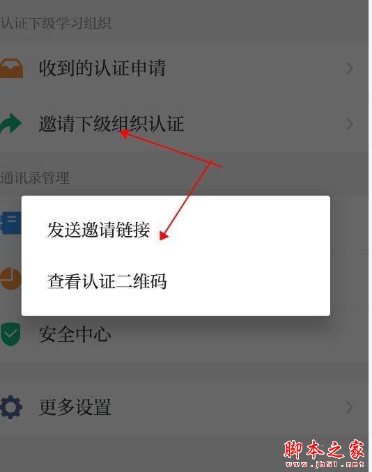 打开通讯录→点击“管理”→“邀请下级组织认证”→与需要建立下级关系的管理员加好友,并发送链接。