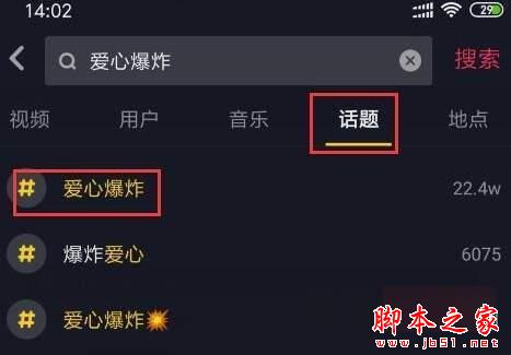 1.第一步,在抖音上搜索“爱心爆炸”,找到这个话题,点进去;