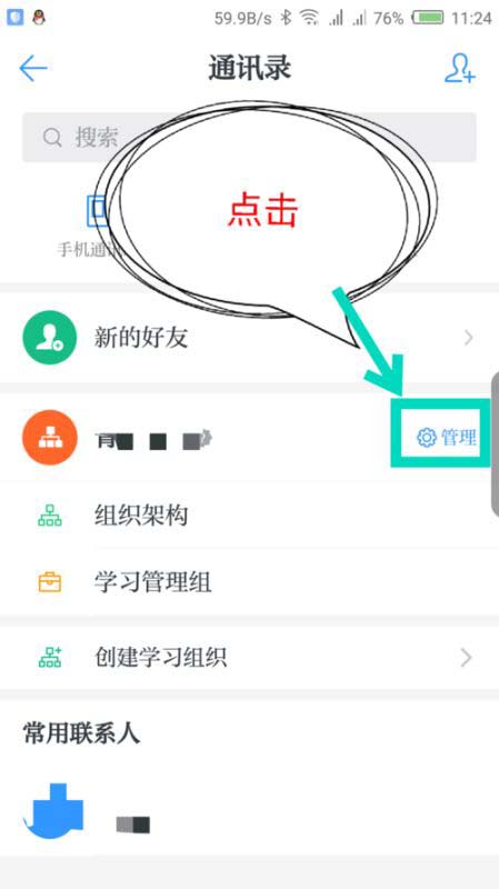 打开通讯录后,找到要设置水印的学习组织,点击组织名称右边的管理两个字。如图所示
