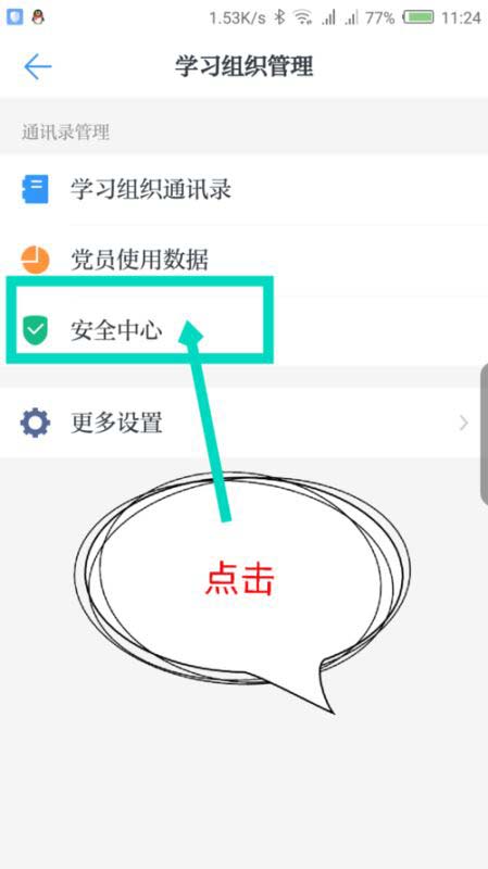 点击管理后,打开学习组织群的管理界面,点击下面显示的安全中心选项。如图所示