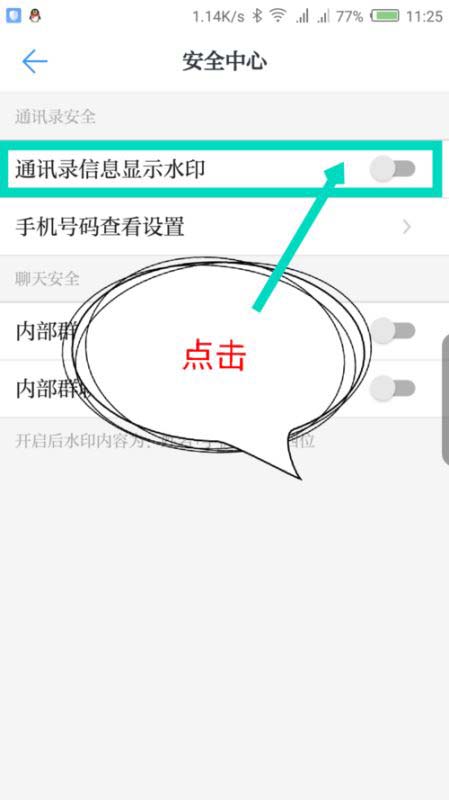 打开安全中心界面后,点击上面的通讯录信息显示水印后面的选项,开启水印显示。如图所示