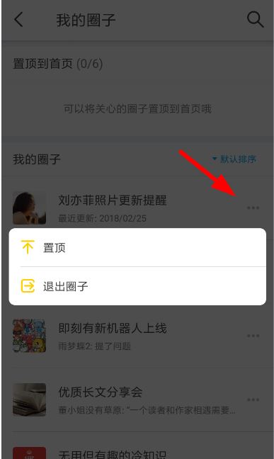 2、在其中找到需要退出的圈子之后,只需要点击右侧的“...”按钮,我们就可以通过“退出圈子”按钮完成设置。