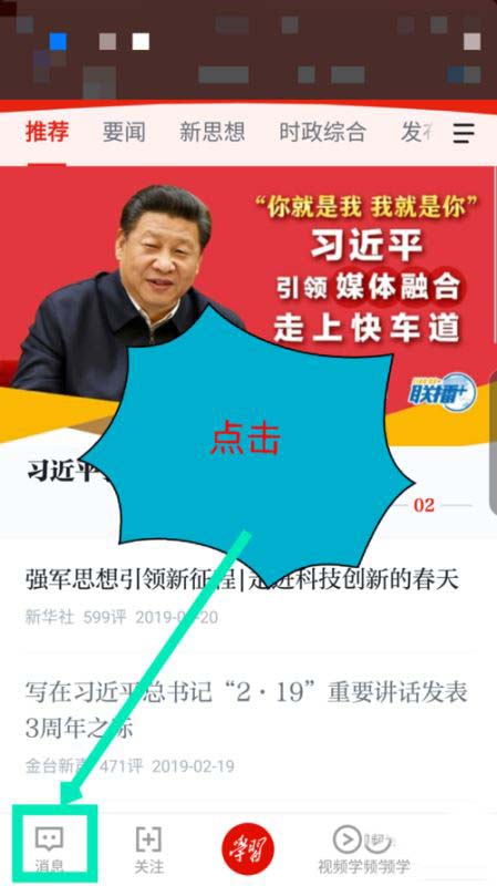 在打开的学习强国软件的主界面,点击底部菜单中的消息选项,在底部最左边。如图所示