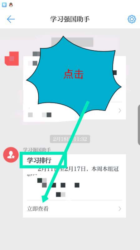 在打开的学习强国助手界面,看到学习排行榜消息窗口后,点击立即查看。如图所示