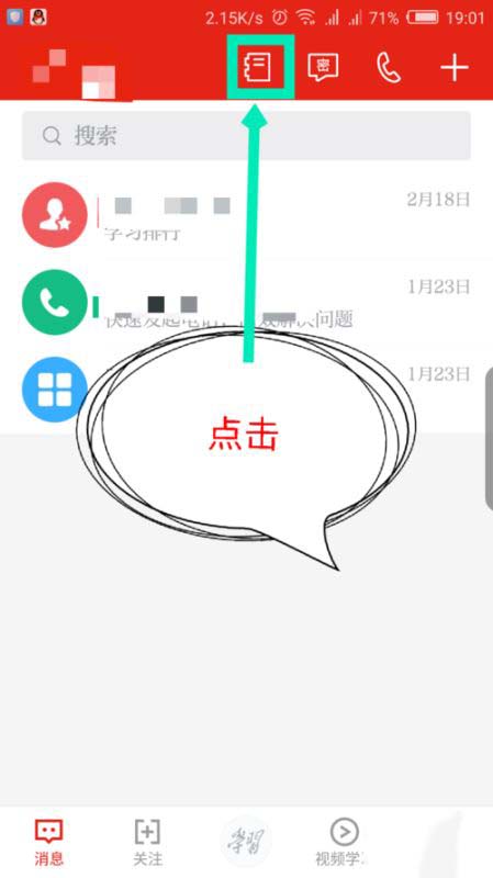 在学习强国软件的消息界面,点击软件顶部的通讯录图标,就是一个笔记本图标。如图所示