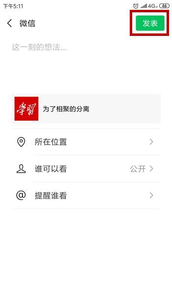 接下来就会打开朋友圈的发布界面,点击右上角的【发表】。