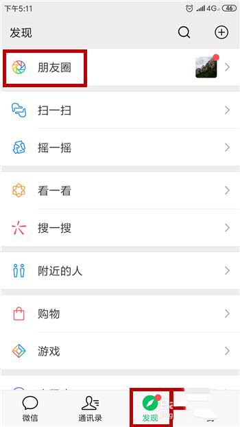 打开微信,点击【发现】,然后点击【朋友圈】。