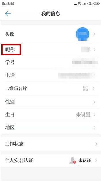 这样会打开个人信息设置,点击其中的【昵称】选项。