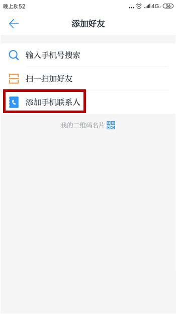 添加好友有三种方式可以选择,这里就以手机联系人为例。