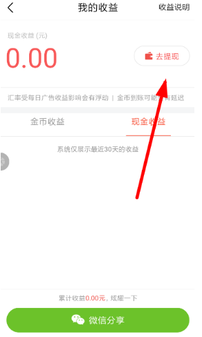 2、接下来从我的收益页面,选择右侧的“去提现”功能(如下所示),这样就能够直接提取账号里的现金收益。