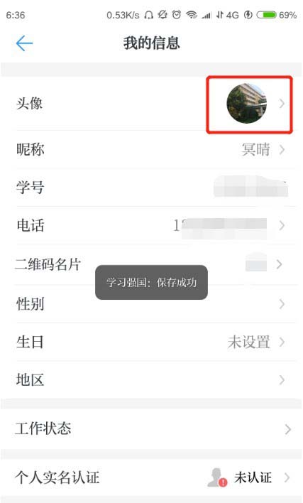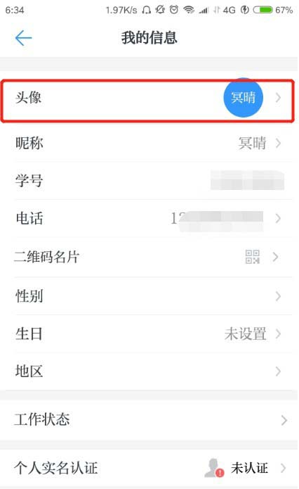 4、点击后,就会在我的信息里看到有一栏是头像,点击它。