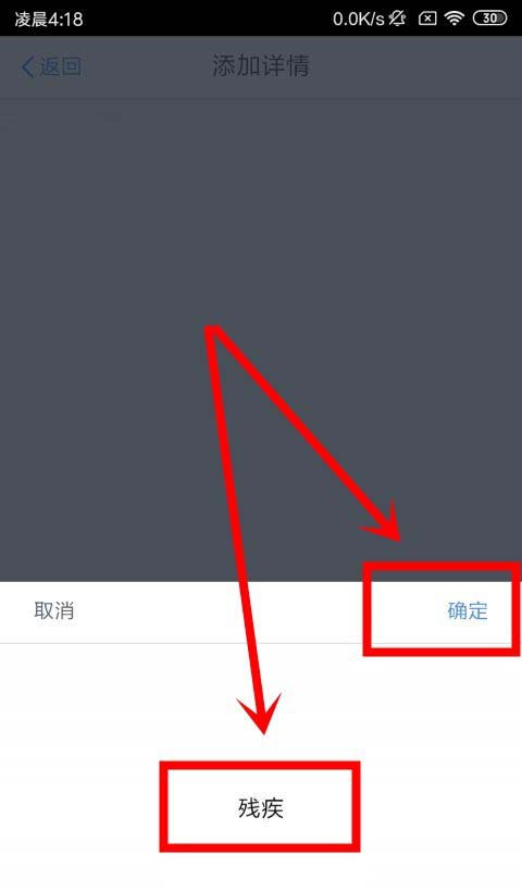 7、之后,会在原先的页面底部出现一个新的页面,在该页面中我们选择好残疾这个选项,然后点击页面右上角的确定按钮。