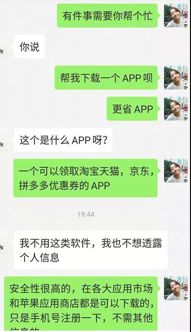 正确的打开方式是这样滴,给人家点赞评论朋友圈后,马上私聊她:萌萌,在吗?(或者:萌萌在忙吗?)一定要带称呼,不要把私聊,聊出了群发的感觉。一般这种打招呼,回复率99%(除非对方真的很讨厌你)在对方回答了以后,你就可以开口说要求了:亲爱的,能帮忙下载个更省App吗?(我一般这么说)在对方还没有来得及回复的时候,紧接着说:领淘宝天猫优惠券的。然后在等对方回复就好啦。