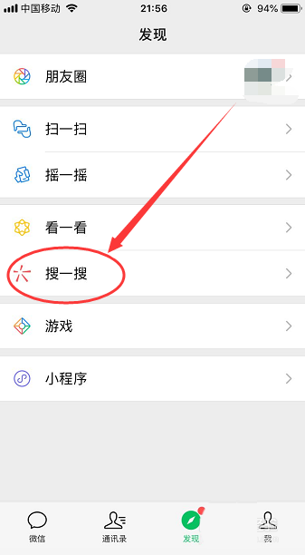 1、首先打开手机微信,点开发现页面,然后打开页面里的搜一搜,如下图