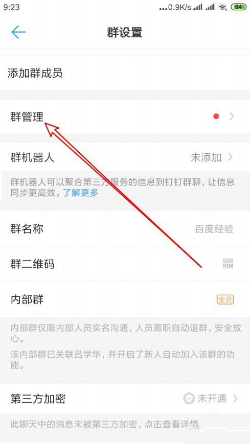 4、这时就会打开钉钉群的群设置页面,在页面中点击“群管理”的菜单项。