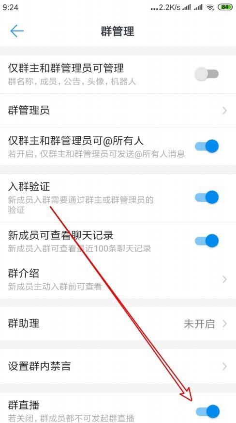 5、然后在打开的群管理页面中,我们找到“群直播”的设置项。