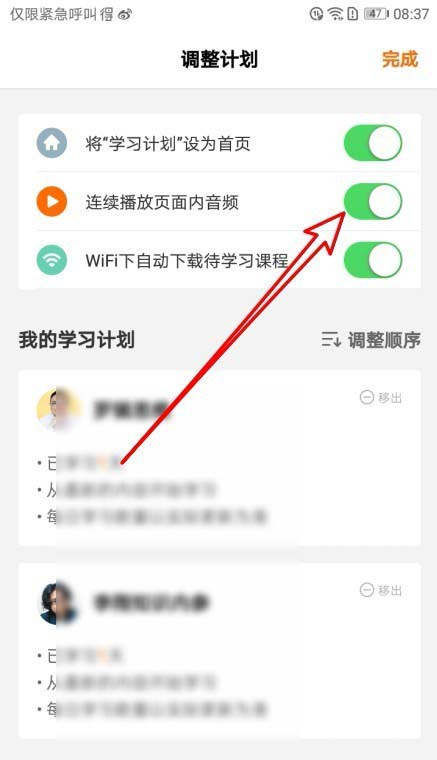 4、这时就会打开得到app的调整计划页面,在页面中找到“连续播放页面内音频”的设置项。