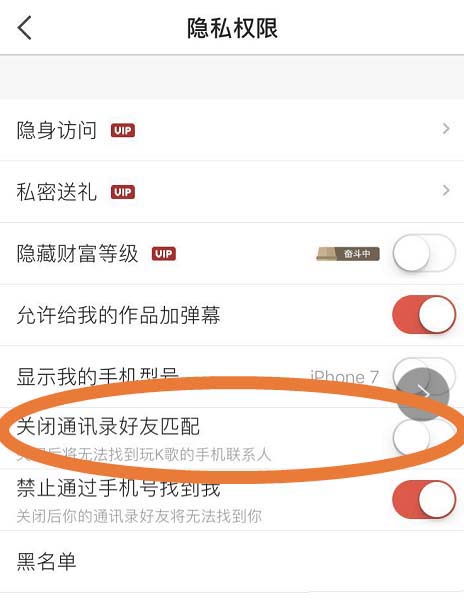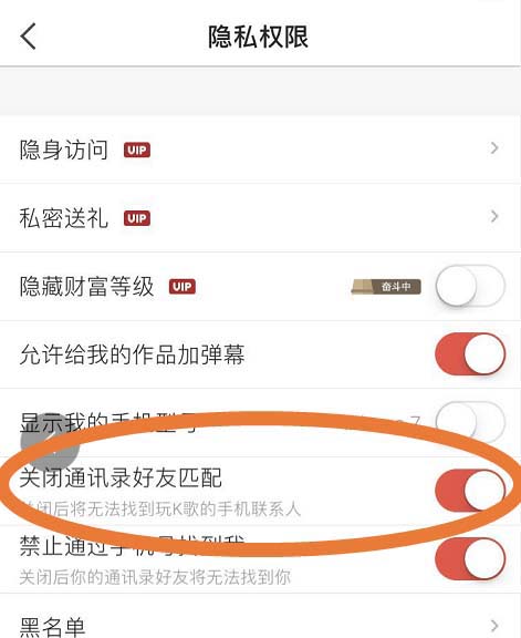 7、这样关闭通讯录好友匹配的功能就开启了,也就是意味着将无法找找到玩全民K歌的通讯录好友了。