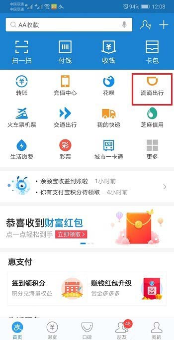 1、在我们的手机上打开支付宝,点击滴滴出行,如下图所示: