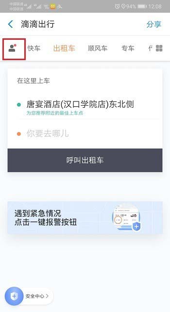 2、进去滴滴出行之后,点击用户图标,如下图所示: