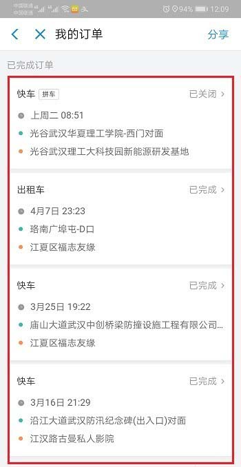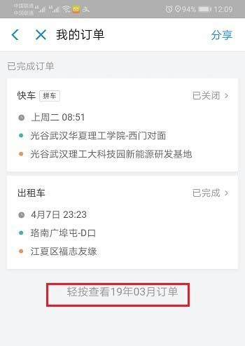 4、进去之后,可以看到最近的滴滴订单,轻按一下,可以看到之前的订单,如下图所示: