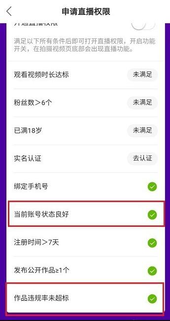 进入【申请直播权限】页面,你可以看到当前账号状态、作品违规率,如果违规率超标,就要不断发布优质作品进行稀释,如图。