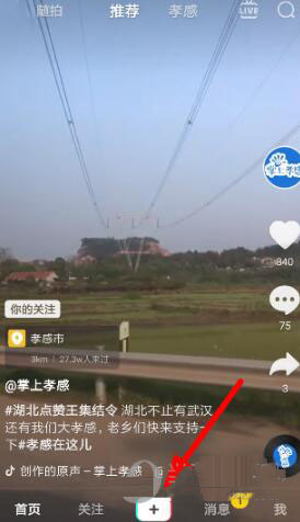 1、若是想要设置抖音里贴纸的显示时间,大家就应该先从主页底端选择“+”按钮,进入拍摄界面之后上传视频素材,或者直接拍摄视频进行编辑。