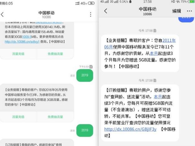 中国移动用户发送“2019”到10086可参加查“网龄”送流量活动。入网十年以上或可获得三个月每月10GB流量,五年以上为5GB,五年以下为3GB。