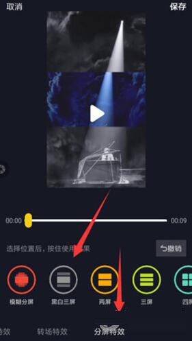 3、而在特效设置的列表里,只要选择下方的“分屏特效”分类,我们就可以在列表里找到并且设置“黑白三屏”特效,让视频变得更加炫酷。
