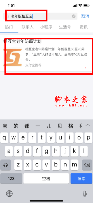 1.打开支付宝app,直接搜索老年版相互宝,如下图所示: