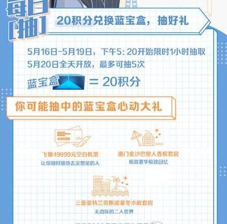(2)5月16日 - 5月19日,每个账户每天在活动时间内有1次抽奖机会,每次抽奖消耗20积分;5月20日当天,每个账户有5次抽奖机会,每次将消耗20积分。