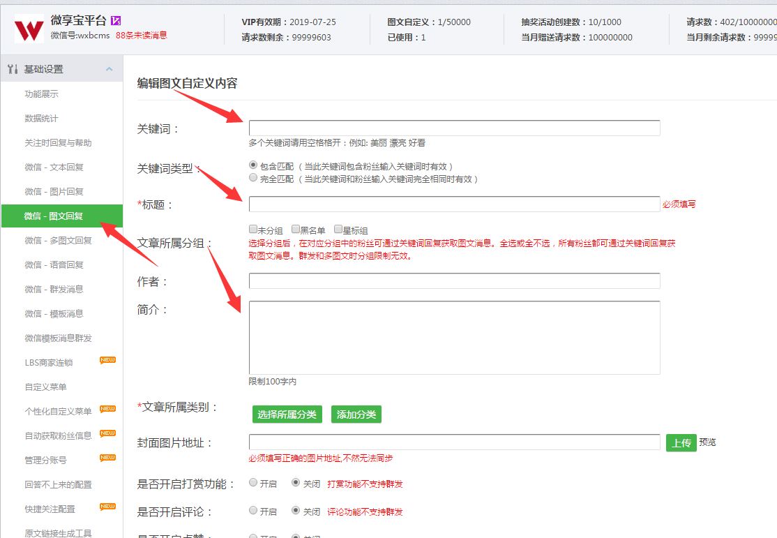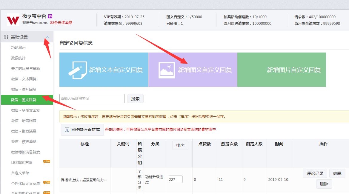第三:在微享宝基础设置--图文回复里,添加自定义图文回复,如下图