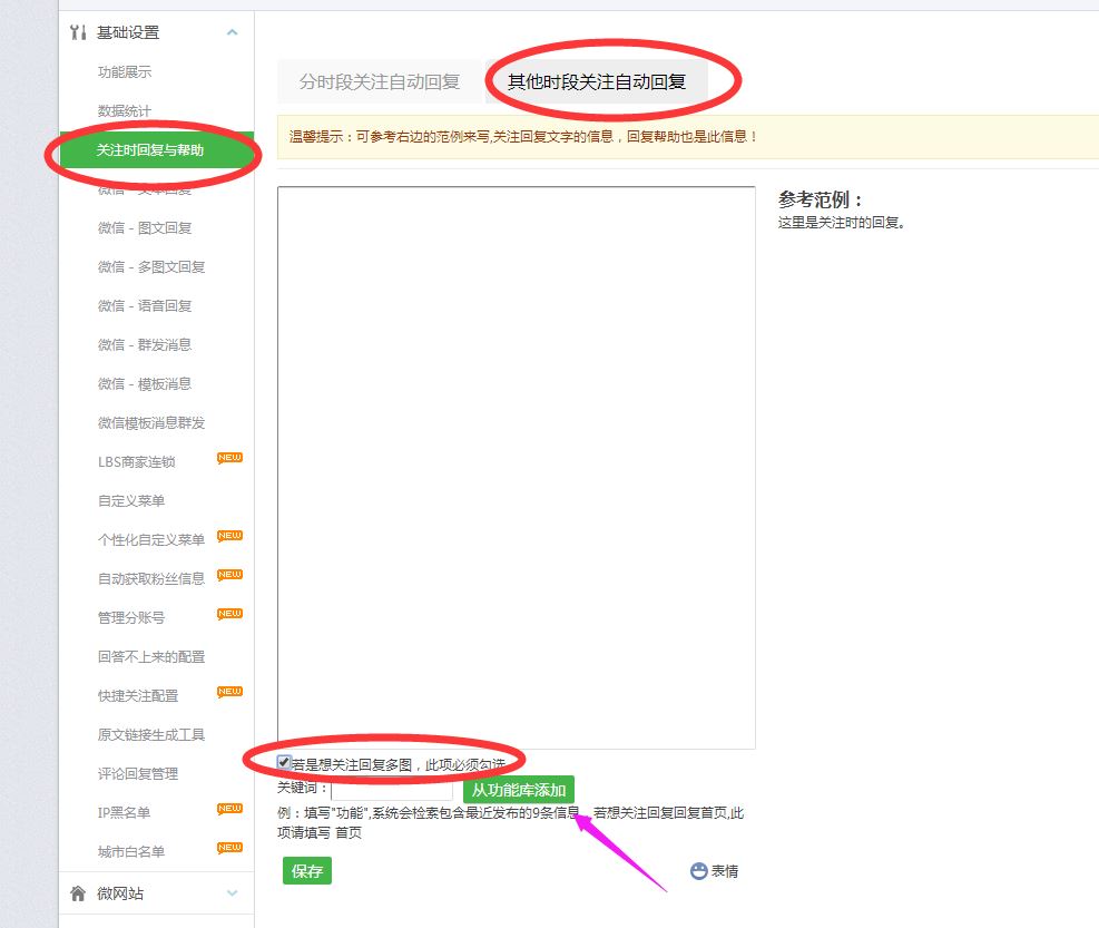 第五:左侧的 基础设置→其他时段自动关注回复(分时段关注不需设置),在右面白色框下面打个勾,然后点击→从功能库中添加,找到刚填加的自定义图文选中保存即可,需要注意的是记得前面的那个勾要选中,检查下如果没有选中,就再保存一次.
